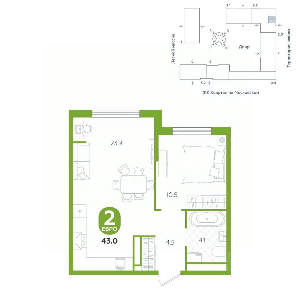 Это экологически чистая зона с видом на лес с разнообразием хвойных и лиственных деревьев. Вся инфраструктура в шаговой доступности - магазины, кафе, пункты выдачи. В планах - школа и детский сад.