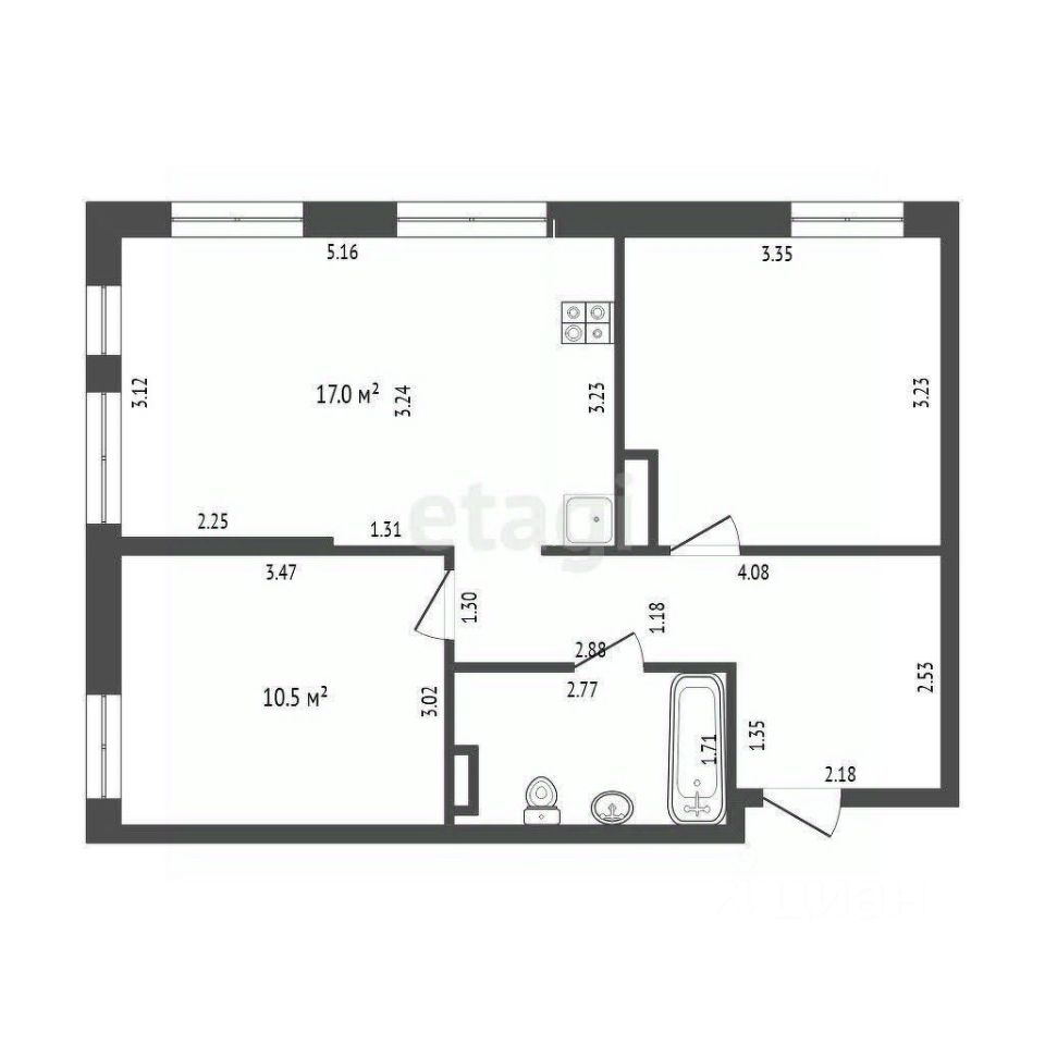 просторная 16.9 кв.м. кухня-гостиная, 2 комнаты, раздельный санузел.