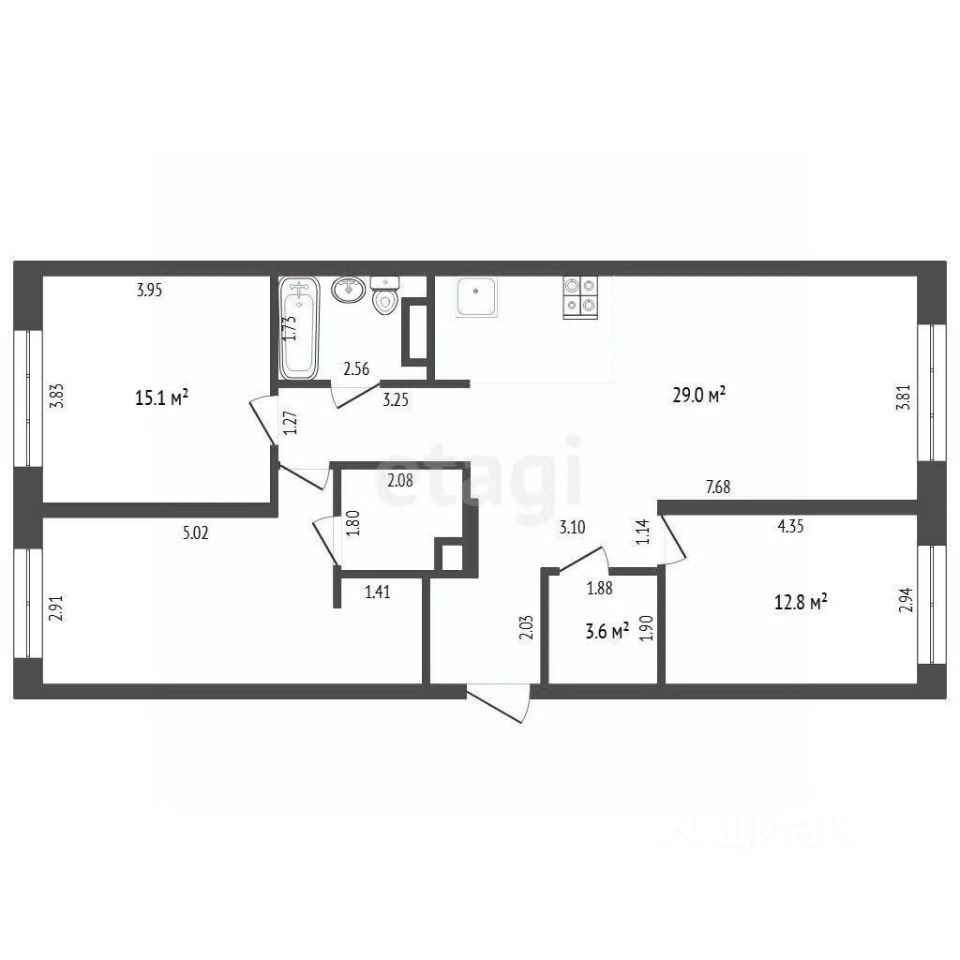 Входная группа квартиры оформлена с умом: две ниши под шкафы и отдельное пространство для гардеробной или постирочной, что обеспечивает максимальную функциональность. Просторная кухня-гостиная площадью более 29 кв.м станет настоящим центром вашего дома, где вы сможете готовить изысканные блюда и проводить незабываемые вечера в кругу семьи и друзей.