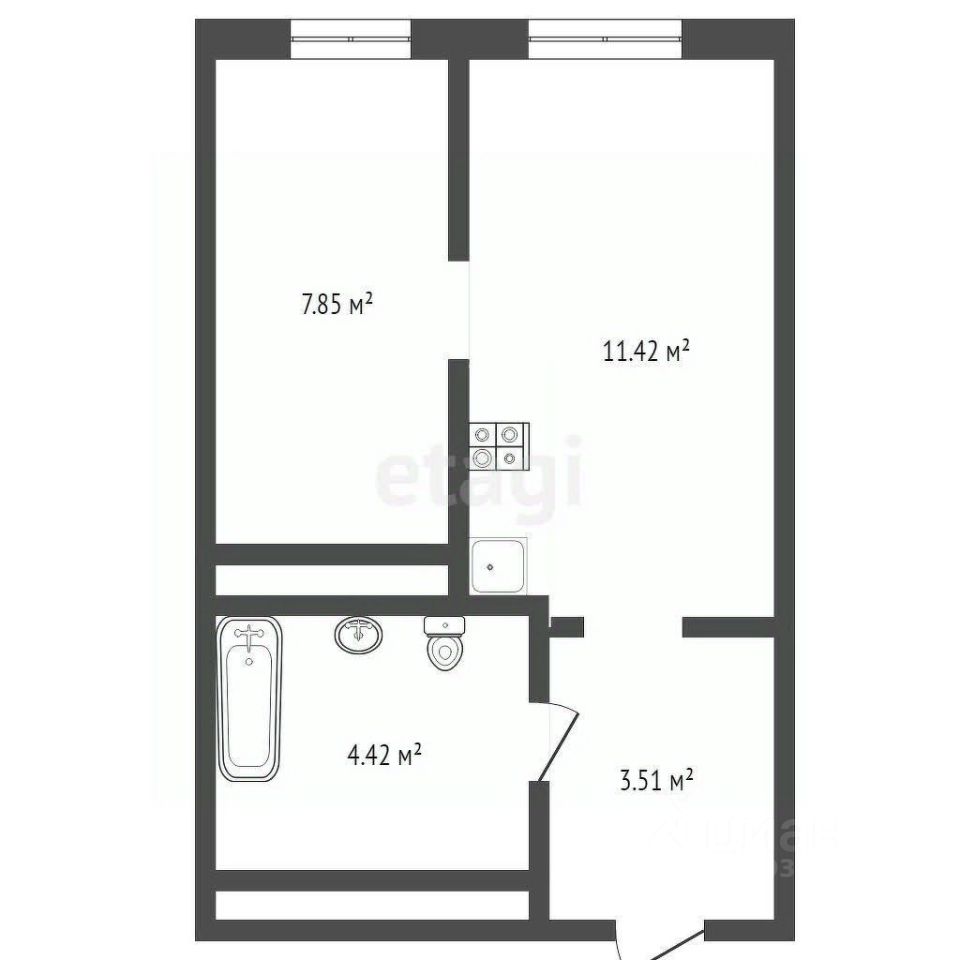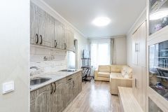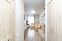 Удачная и функциональная планировка для студии - прихожая, совмещённый санузел, кухня с выделенной зоной отдыха и изолированная зона спальни.