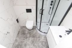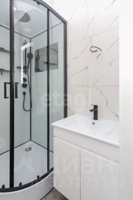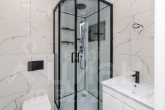 Санузел: совмещённый, облицован керамогранитом, установлена инсталляция, душевая кабина, раковина с тумбой, оборудован теплый пол;