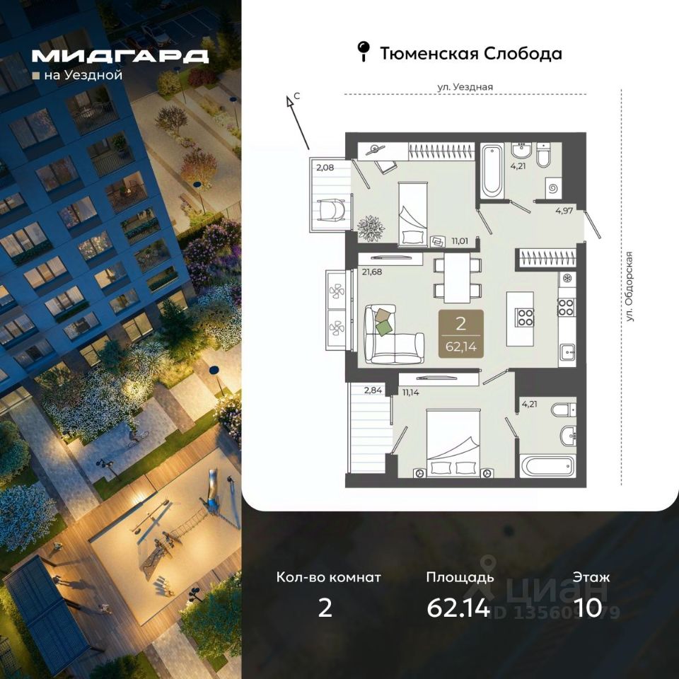 Продается 2-комн. квартира от застройщика в ЖК "Мидгард на Уездной" на 10 этаже. Квартира без отделки, полностью готова к чистовой отделке и дальнейшему ремонту. Общая площадь: 62.14 кв.м., жилая: 22.15 кв.м., площадь просторной кухни-столовой: 21.68 кв.м. Комнаты изолированные, все окна выходят на одну сторону. В квартире один балкон и одна лоджия, два совмещенных санузла. Высота потолков 2.72 м.