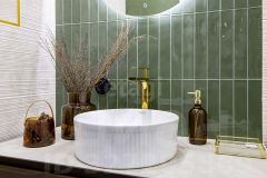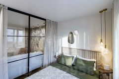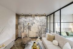 • Детали интерьера: Изысканная золотая фурнитура, декоративные элементы (элегантные полоски) и эффектная фреска с пейзажем на стене создают неповторимую атмосферу.