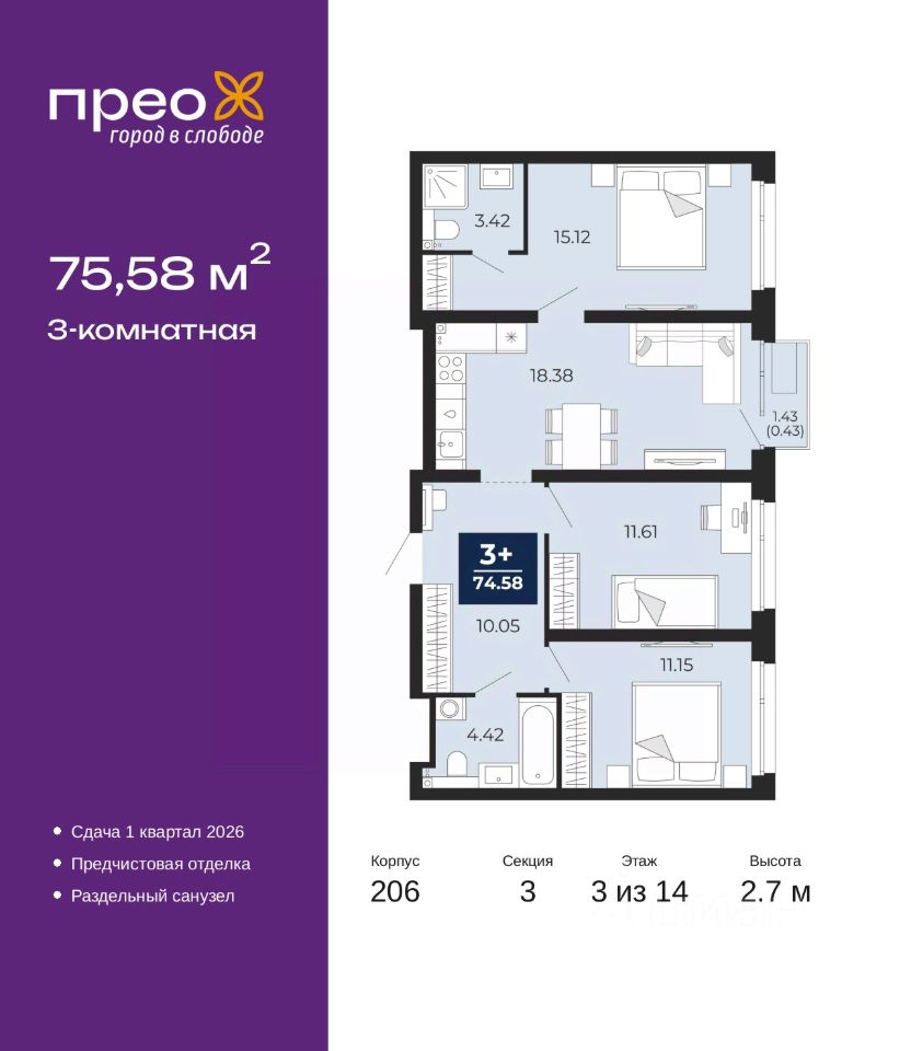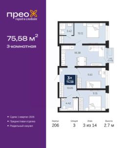 3-комн. квартира с предчистовой отделкой в ЖК "Прео" на 3 этаже. Общая площадь: 75.58 кв.м. Высота потолков 2.7 м.