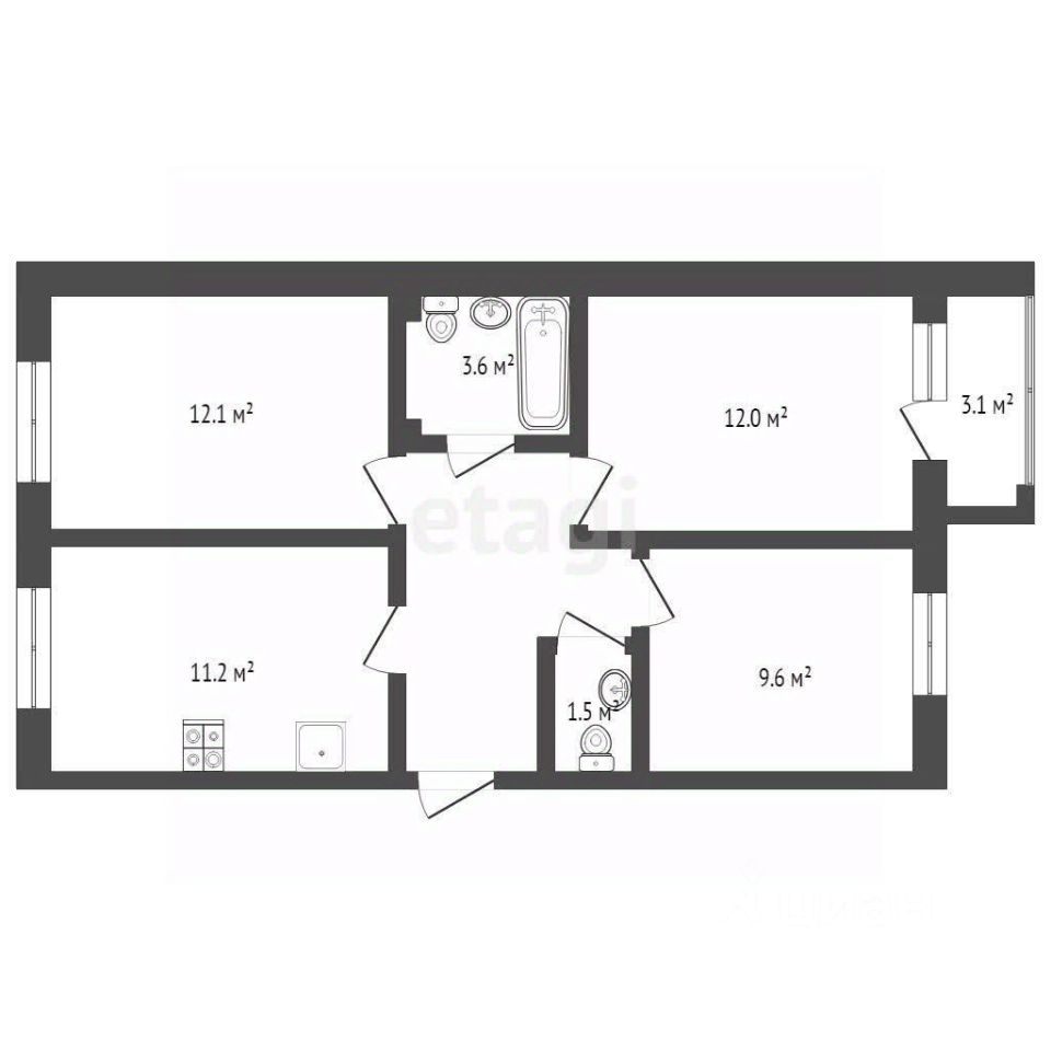Квартира имеет 3 отдельные комнаты и просторную кухню.