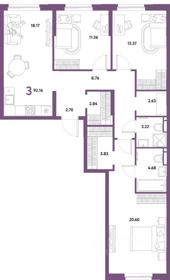 Продаётся 3-комнатная квартира в строящемся доме (Дом "Майорка" (3 этап, Краснооктябрьская, 10к3)), срок сдачи: IV-кв. 2028, общей площадью 92.16 кв.м., на 2 этаже. Новый жилой комплекс "Остров-сад" от Специализированного застройщика "Страна. Коммунистическая" расположен по адресу: г. Тюмень, по ул. Ярославская.