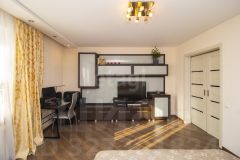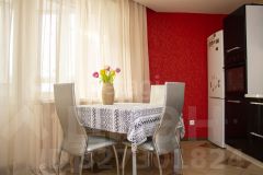 В отделке использованы современные материалы: качественный ламинат, двухуровневые натяжные потолки со встроенным светом. На кухне выполнен теплый пол, одна из стен акцентно выделена стильной декоративной штукатуркой.