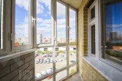 Кухня с выходом на застекленный балкон (витражное остекление, пол из плитки).