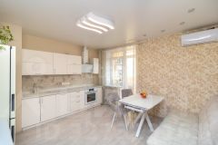 В квартире выполнен современный ремонт. При ремонте использован немецкий ламинат высокого класса. Дополнительно при продаже остаётся: кухонный гарнитур с доводчиками Bloom, посудомоечная машина Siemens, духовой шкаф Gorenje, вытяжка, производительный кондиционер Balu на 35 м2, все шкафы, качественная сантехника.