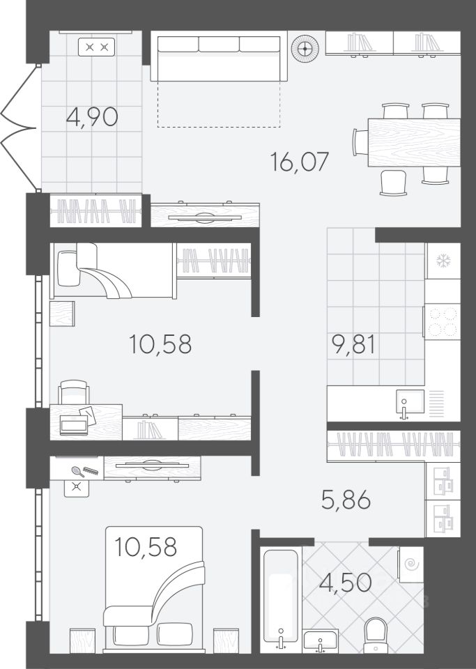 Продуманная геометрия комнат позволит легко зонировать пространство и подобрать необходимую мебель.