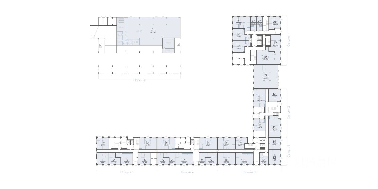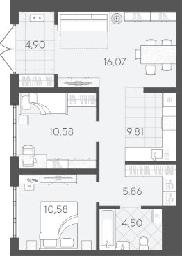 Квартира с 2 спальнями площадью 62,3 кв.м