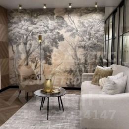 Детали интерьера: Изысканная золотая фурнитура, декоративные элементы (элегантные полоски) и эффектная фреска с пейзажем на стене создают неповторимую атмосферу.