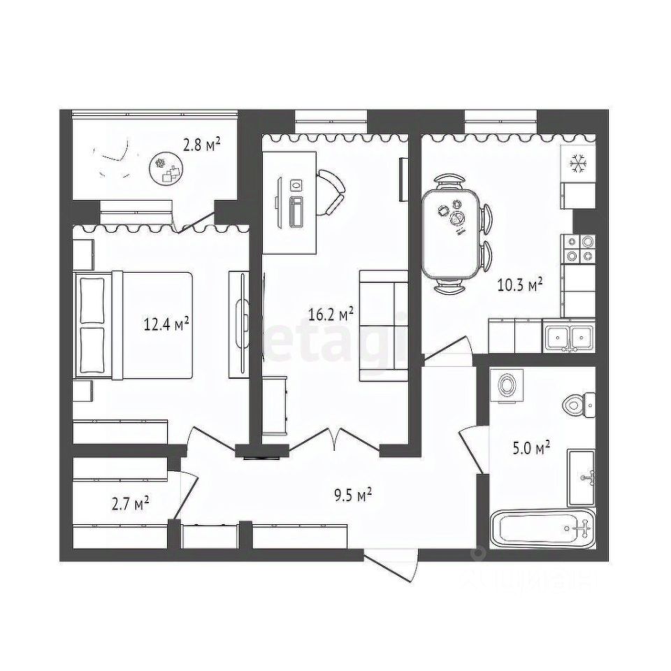 Кухня: 10,3 м² — достаточно места для столовой зоны.