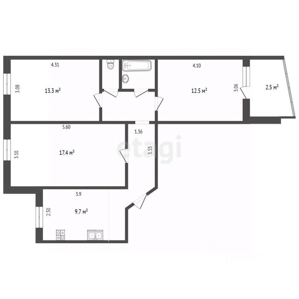 Кухня: 9,7 м² (хватит места и для готовки, и для семейных ужинов).