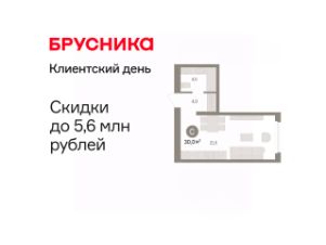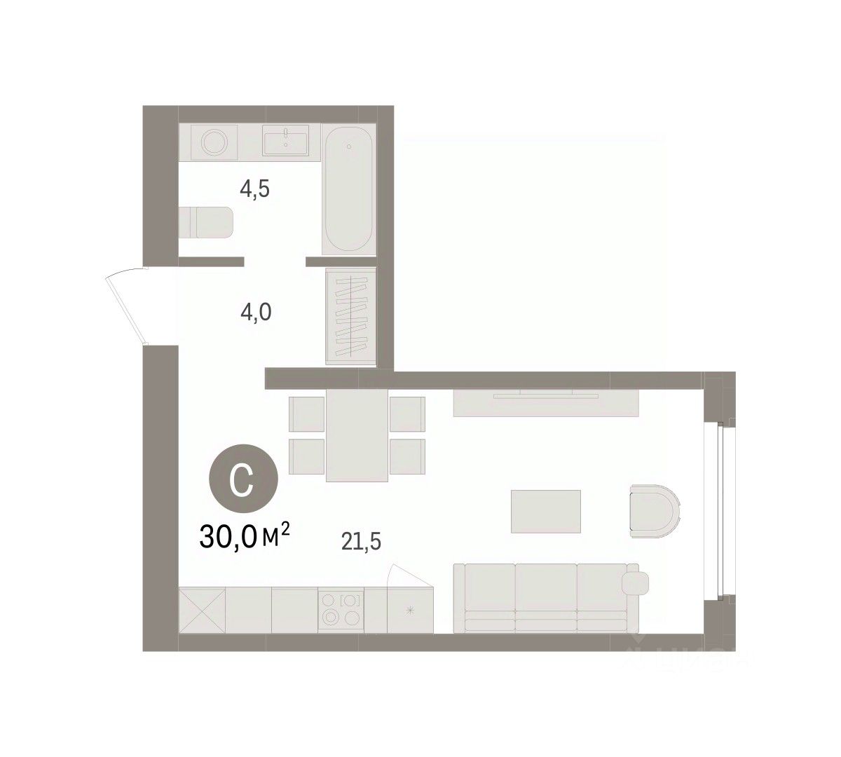 1-комн. студия от застройщика с предчистовой отделкой в ЖК "Зарека" на 2 этаже. Общая площадь: 30 кв.м., площадь гостиной 21.5 кв.м., из которых 5 кв.м. выделено под кухонную зону. Все окна выходят на одну сторону. В квартире один совмещенный санузел. Высота потолков 2.7 м.