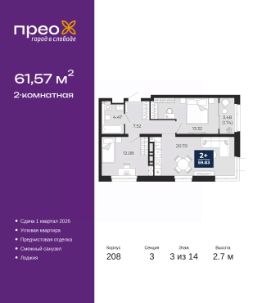 2-комн. квартира от застройщика с предчистовой отделкой в ЖК "Прео" на 3 этаже. Общая площадь: 61.57 кв.м., жилая: 25.4 кв.м., площадь просторной кухни-столовой: 20.7 кв.м. Квартира угловая, идеально подойдет любителям тишины и панорамных видов. В квартире одна лоджия, один совмещенный санузел. Высота потолков 2.7 м.