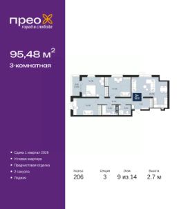 Продается 3-комн. квартира с предчистовой отделкой в ЖК "Прео" на 9 этаже. Общая площадь: 95.48 кв.м., жилая: 43.3 кв.м., площадь просторной кухни-столовой: 26.06 кв.м. Угловая квартира, окна oбecпeчивaют paвнoмepнoe ocвeщeниe в тeчeниe дня. В квартире одна лоджия, два совмещенных санузла. Высота потолков 2.7 м.