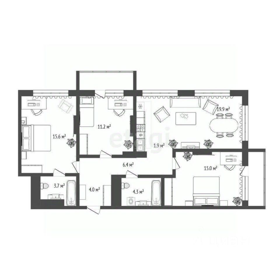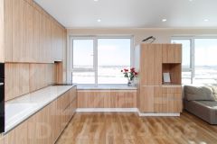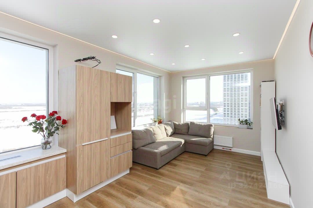Очень удачная планировка: мастер-спальня со своей ванной комнатой, и еще 2 комнаты с окнами в пол и выходом на балкон, просторная кухня-гостиная с 3 большими окнами на 2 стороны света, 2 просторных санузла, продуманные ниши под шкафы, красивейшие входные группы с мягкой мебелью, закрытый двор с видеонаблюдением, ну и, конечно, потрясающее озеленение территорий которым так славится Брусника!