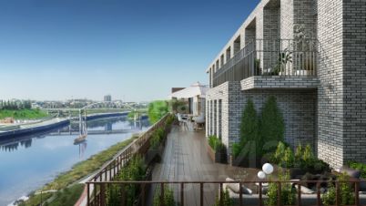 Вид из самой квартиры на пешеходный бульвар с ландшафтным дизайном, иллюминацией и озелененеием, а также боковой вид на реку.