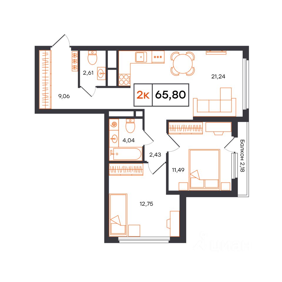 Общая площадь65,8 м²