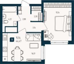Продаётся 1-комнатная квартира в строящемся доме (Дом Каскад (ГП-2)), срок сдачи: III-кв. 2027, общей площадью 44.47 кв.м., на 15 этаже. Новый жилой комплекс "Квартал Мятный" от Специализированного застройщика "Юпитер" расположен по адресу: г. Тюмень по ул. Кулибина.