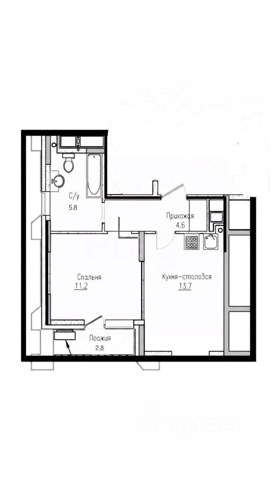 Современный евроформат (кухня-гостиная + изолированная спальня). Площадь помещений позволяет реализовать любые дизайнерские решения.