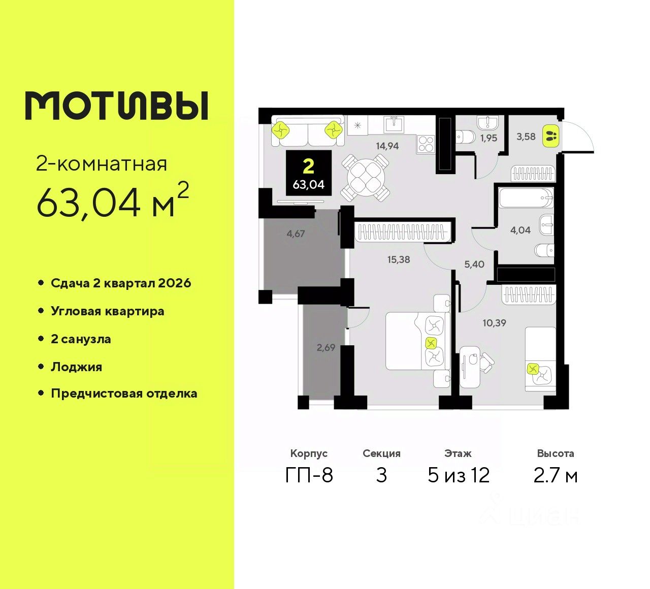 Двухкомнатная квартира с предчистовой отделкой в ЖК "Мотивы" на 5 этаже. Общая площадь: 63.04 кв.м., жилая: 25.77 кв.м., площадь просторной кухни-столовой: 14.94 кв.м. Квартира угловая, очень светлая, естественная вентиляция при открытии окон. В квартире две лоджии, один совмещенный и один раздельный санузел. Высота потолков 2.7 м.