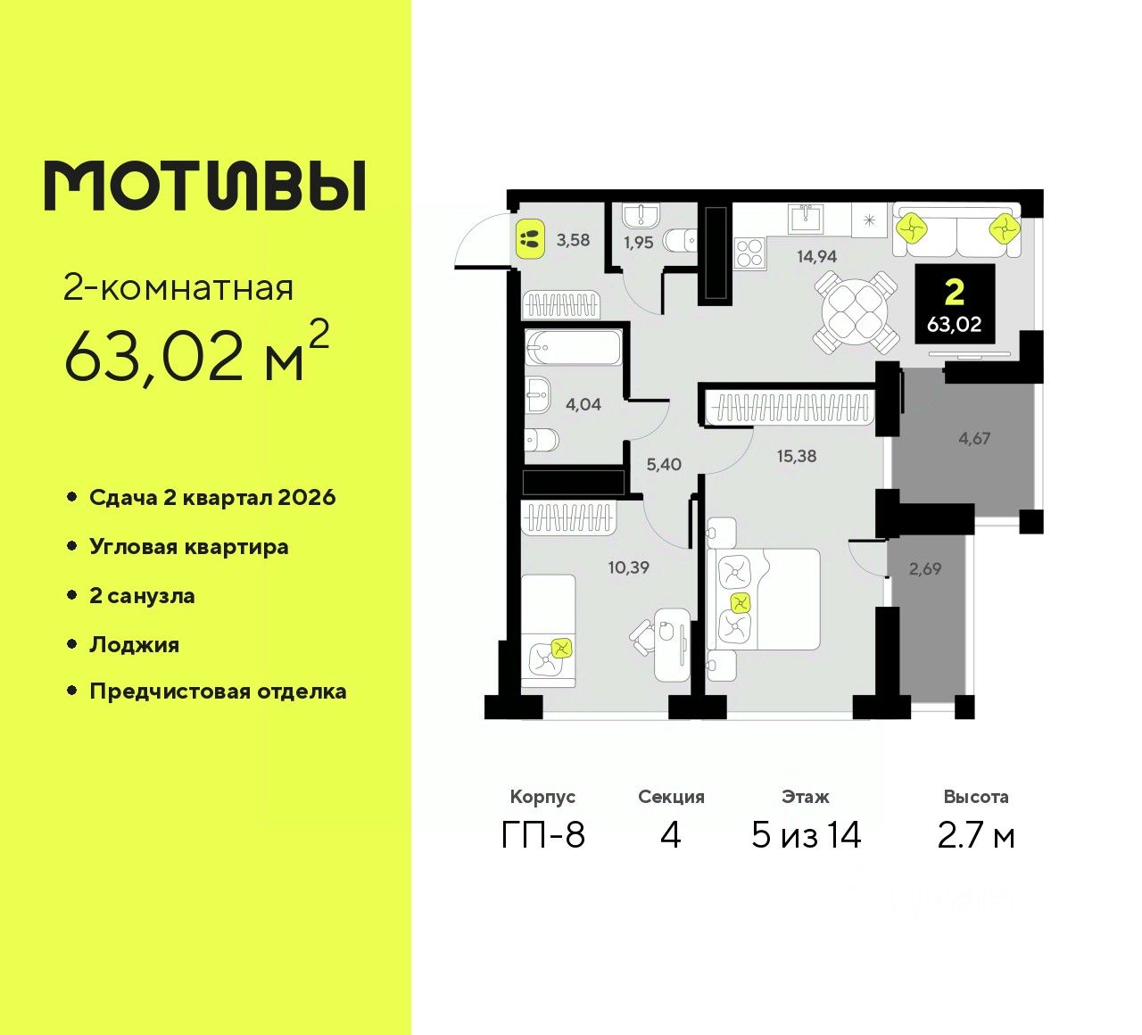 Продается двухкомнатная квартира с предчистовой отделкой в ЖК "Мотивы" на 5 этаже. Общая площадь: 63.02 кв.м., жилая: 25.77 кв.м., площадь просторной кухни-столовой: 14.94 кв.м. Квартира угловая, очень светлая, естественная вентиляция при открытии окон. В квартире две лоджии, один совмещенный и один раздельный санузел. Высота потолков 2.7 м.