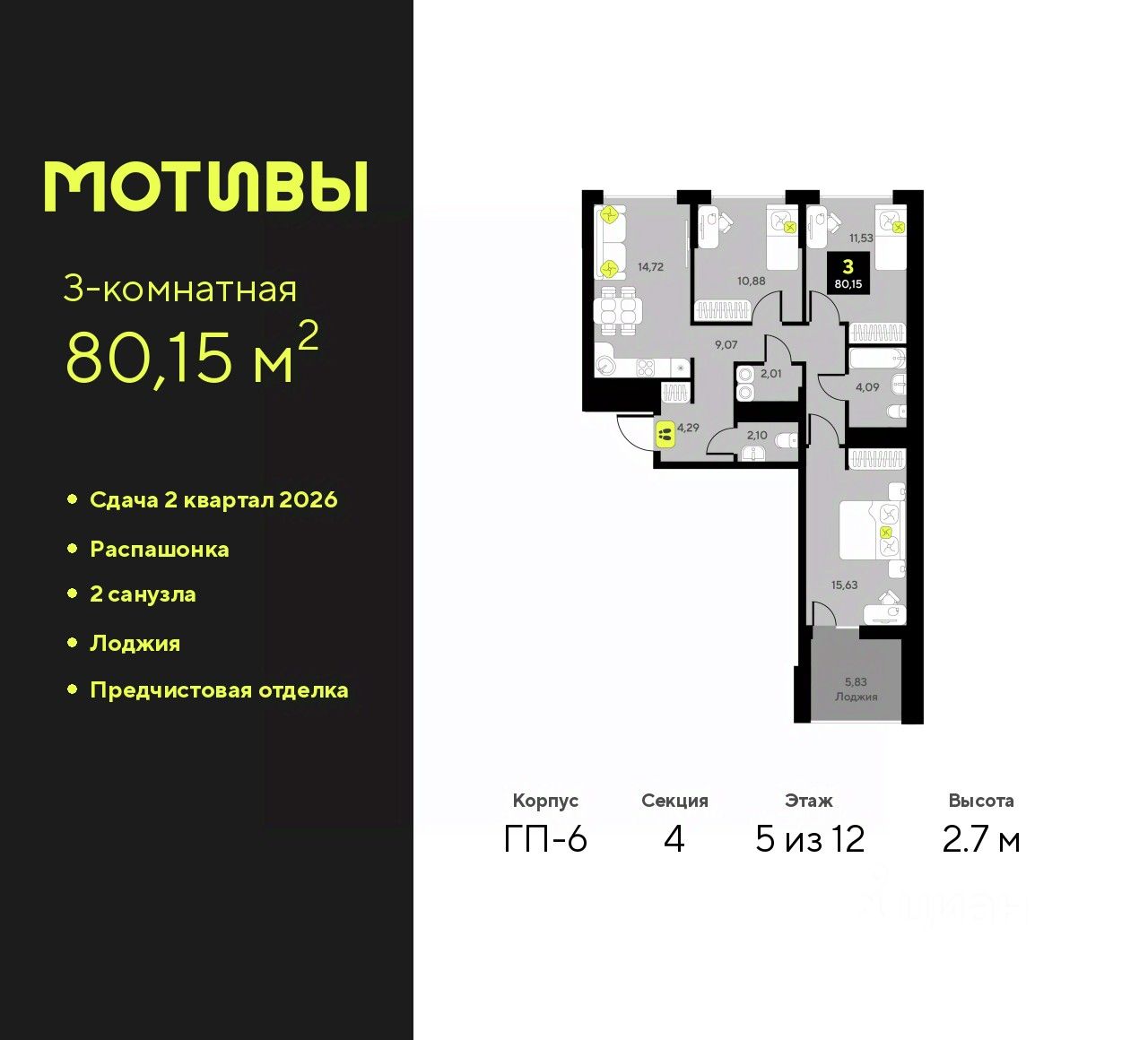 Продается 3-комн. квартира от застройщика с предчистовой отделкой в ЖК "Мотивы" на 5 этаже. Общая площадь: 80.15 кв.м., жилая: 38.04 кв.м., площадь просторной кухни-столовой: 14.72 кв.м. Квартира - распашонка, без проходных комнат, окна выходят на paзные стороны дома. В квартире одна лоджия, один совмещенный и один раздельный санузел. Высота потолков 2.7 м.
