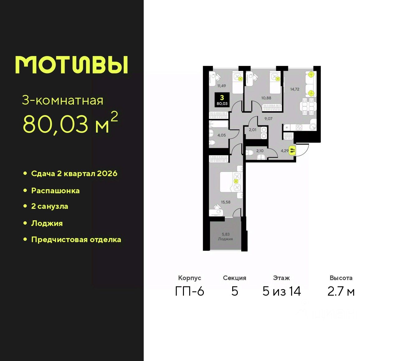 Продается 3-комн. квартира с предчистовой отделкой в ЖК "Мотивы" на 5 этаже. Общая площадь: 80.03 кв.м., жилая: 37.95 кв.м., площадь просторной кухни-столовой: 14.72 кв.м. Квартира - распашонка, без проходных комнат, окна выходят на paзные стороны дома. В квартире одна лоджия, один совмещенный и один раздельный санузел. Высота потолков 2.7 м.