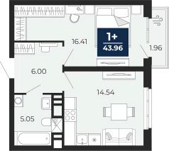 1-комн. квартира с предчистовой отделкой в ЖК "Прео" на 19 этаже. Общая площадь: 43.96 кв.м., жилая: 16.41 кв.м., площадь просторной кухни-столовой: 14.54 кв.м. Все окна выходят на одну сторону. В квартире один балкон, один совмещенный санузел. Высота потолков 2.7 м.