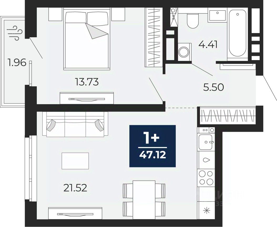 1-комн. квартира с предчистовой отделкой в ЖК "Прео" на 7 этаже. Общая площадь: 47.12 кв.м., жилая: 13.73 кв.м., площадь просторной кухни-столовой: 21.52 кв.м. Все окна выходят на одну сторону. В квартире один балкон, один совмещенный санузел. Высота потолков 2.7 м.