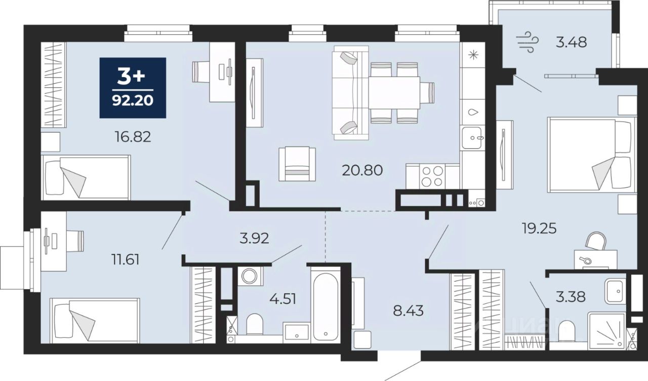 3-комн. квартира от застройщика в ЖК "Прео" на 3 этаже. Общая площадь: 92.2 кв.м. Высота потолков 2.7 м.