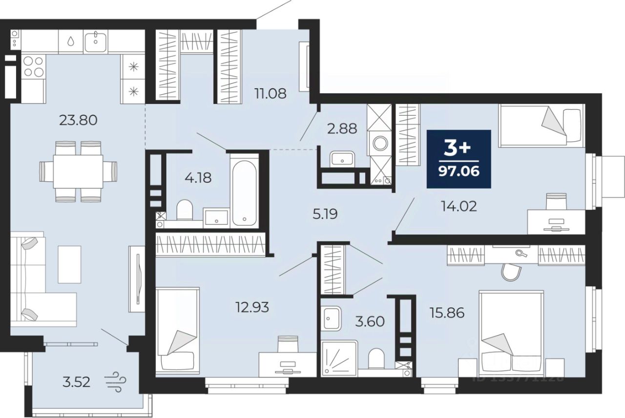 Просторная трехкомнатная квартира в ЖК "Прео" на 12 этаже. Общая площадь: 97.06 кв.м. Высота потолков 2.7 м.