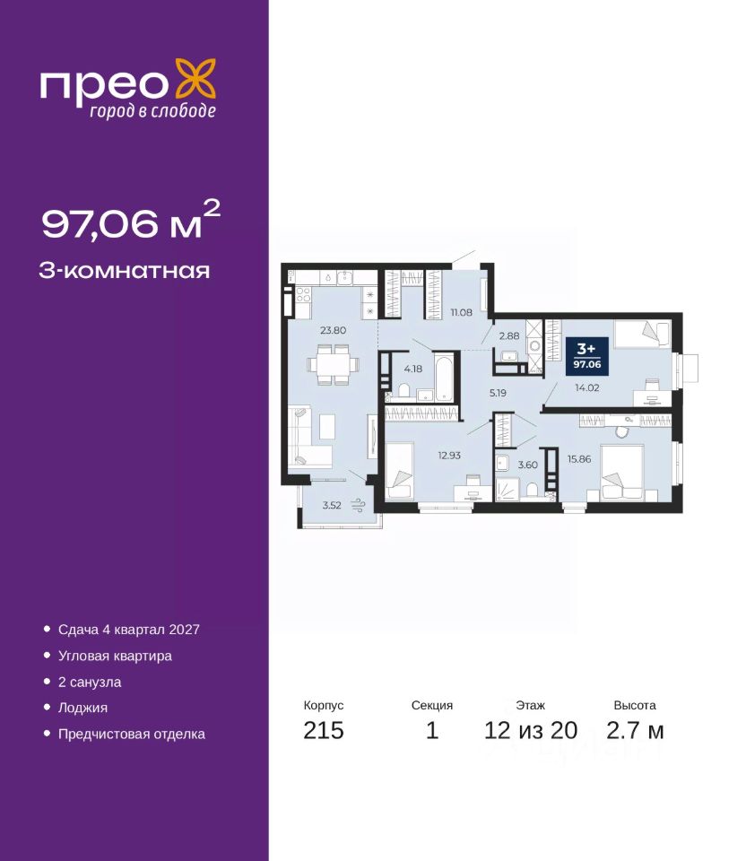 Продается 3-комн. квартира с предчистовой отделкой в ЖК "Прео" на 12 этаже. Общая площадь: 97.06 кв.м., жилая: 42.81 кв.м., площадь просторной кухни-столовой: 23.8 кв.м. Квартира угловая, идеально подойдет любителям тишины и панорамных видов. В квартире одна лоджия, два совмещенных санузла. Высота потолков 2.7 м.