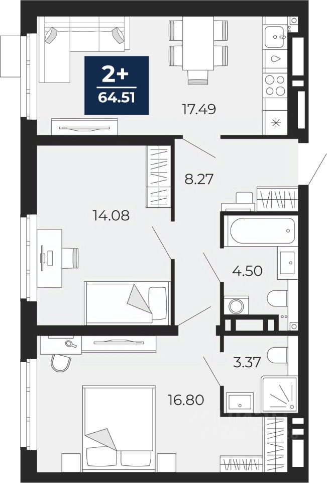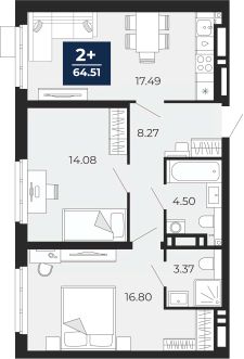 2-комн. квартира в ЖК "Прео" на 19 этаже. Общая площадь: 64.51 кв.м. Высота потолков 2.7 м.