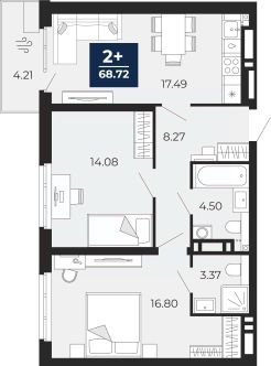 Просторная 2-комн. квартира с предчистовой отделкой в ЖК "Прео" на 8 этаже. Общая площадь: 68.72 кв.м., жилая: 30.88 кв.м., площадь просторной кухни-столовой: 17.49 кв.м. Комнаты изолированные, все окна выходят на одну сторону. В квартире один балкон, два совмещенных санузла. Высота потолков 2.7 м.