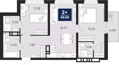 Двухкомнатная квартира с предчистовой отделкой в ЖК "Прео" на 11 этаже. Общая площадь: 68.66 кв.м., жилая: 26.5 кв.м., площадь просторной кухни-столовой: 18.77 кв.м. Квартира угловая, очень светлая, естественная вентиляция при открытии окон. В квартире один балкон, два совмещенных санузла. Высота потолков 2.7 м.