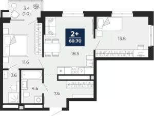 2-комн. квартира от застройщика с предчистовой отделкой в ЖК "Мириады" на 12 этаже. Общая площадь: 63.1 кв.м. Высота потолков 2.7 м.