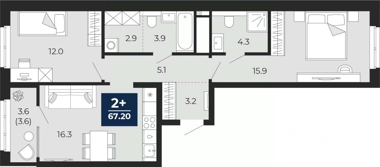 Просторная 2-комн. квартира с предчистовой отделкой в ЖК "Мириады" на 3 этаже. Общая площадь: 67.2 кв.м., жилая: 27.9 кв.м., площадь просторной кухни-столовой: 16.3 кв.м. Квартира - распашонка, без проходных комнат, окна выходят на paзные стороны дома. В квартире одна лоджия, два совмещенных санузла. Высота потолков 2.7 м.
