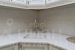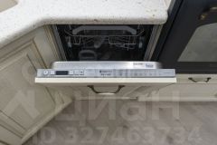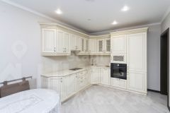 В кухне-гостиной качественный кухонный гарнитур с фасадами из дерева. Техника встроенная