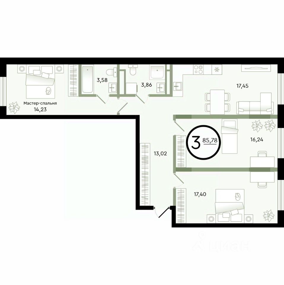 Продаётся 3-комнатная квартира в строящемся доме (ГП-14 (Александра Невского, 9)), срок сдачи: I-кв. 2029, общей площадью 85.78 кв.м., на 3 этаже. Новый малоэтажный жилой комплекс "Зеленые аллеи" от Девелоперской компании "Навигатор" расположен в Калининском районе Тюмени на ул. Бориса Быстрых.
