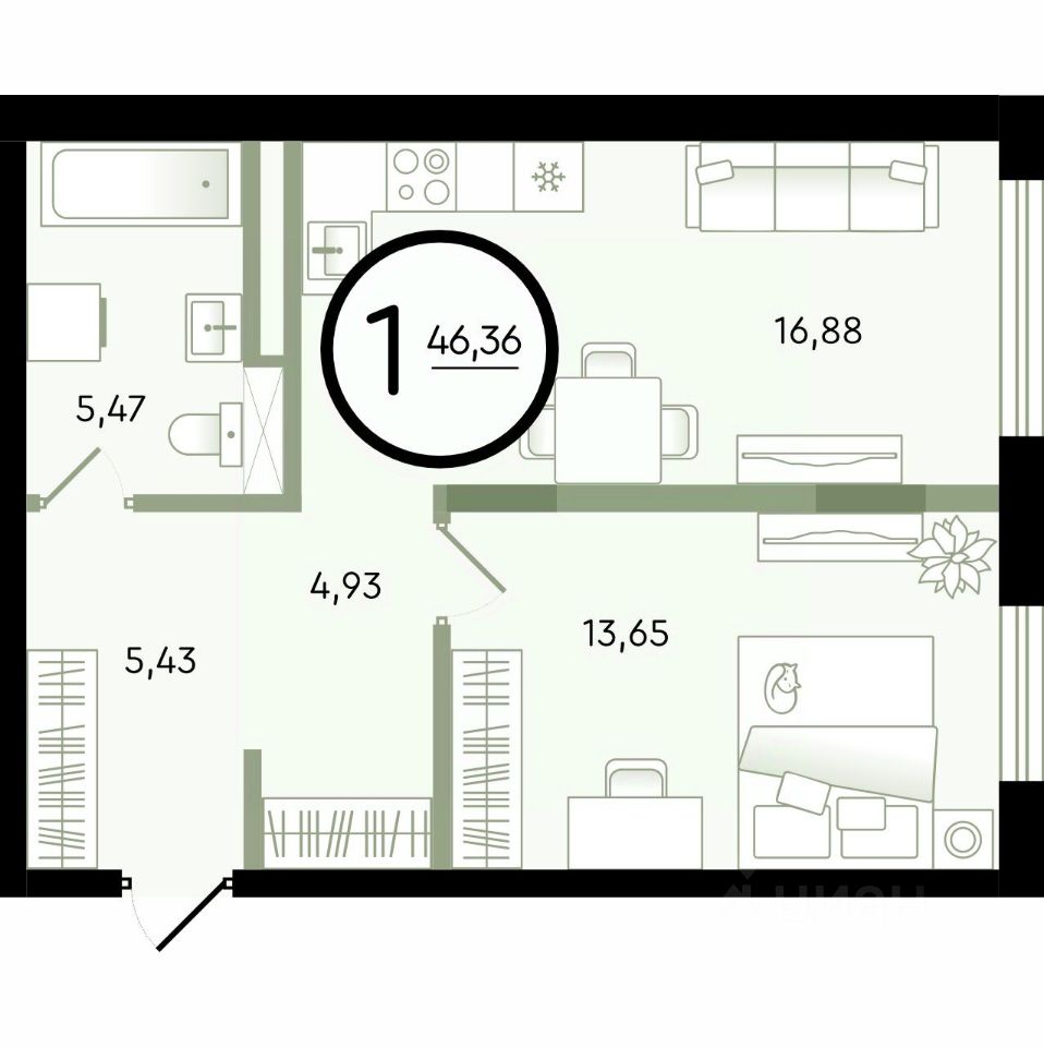 Продаётся 1-комнатная квартира в строящемся доме (ГП-14 (Александра Невского, 9)), срок сдачи: I-кв. 2029, общей площадью 46.36 кв.м., на 4 этаже. Новый малоэтажный жилой комплекс "Зеленые аллеи" от Девелоперской компании "Навигатор" расположен в Калининском районе Тюмени на ул. Бориса Быстрых.