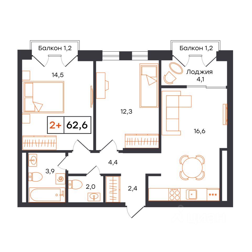 Общая площадь62,6 м²