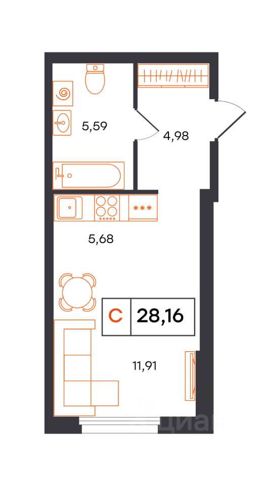 Уютная студия с эргономичной планировкой, сдается в предчистовой отделке в жилом комплексе Фатера.