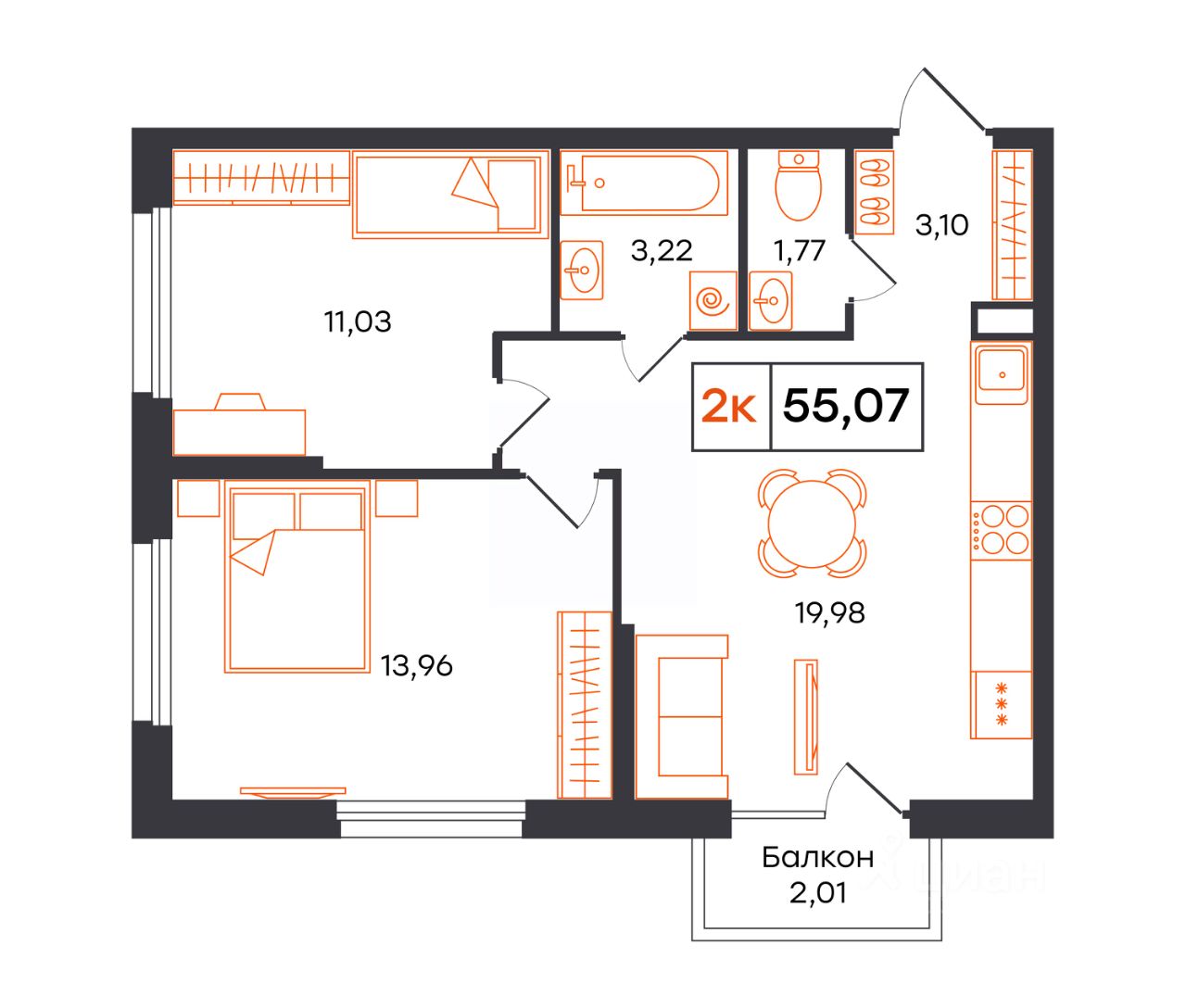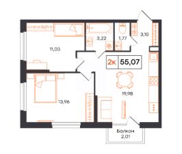Просторная 2-комн. квартира с функциональной планировкой, сдается в предчистовой отделке в жилом комплексе Фатера.