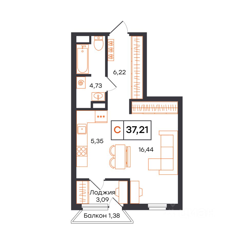 Общая площадь37,21 м²