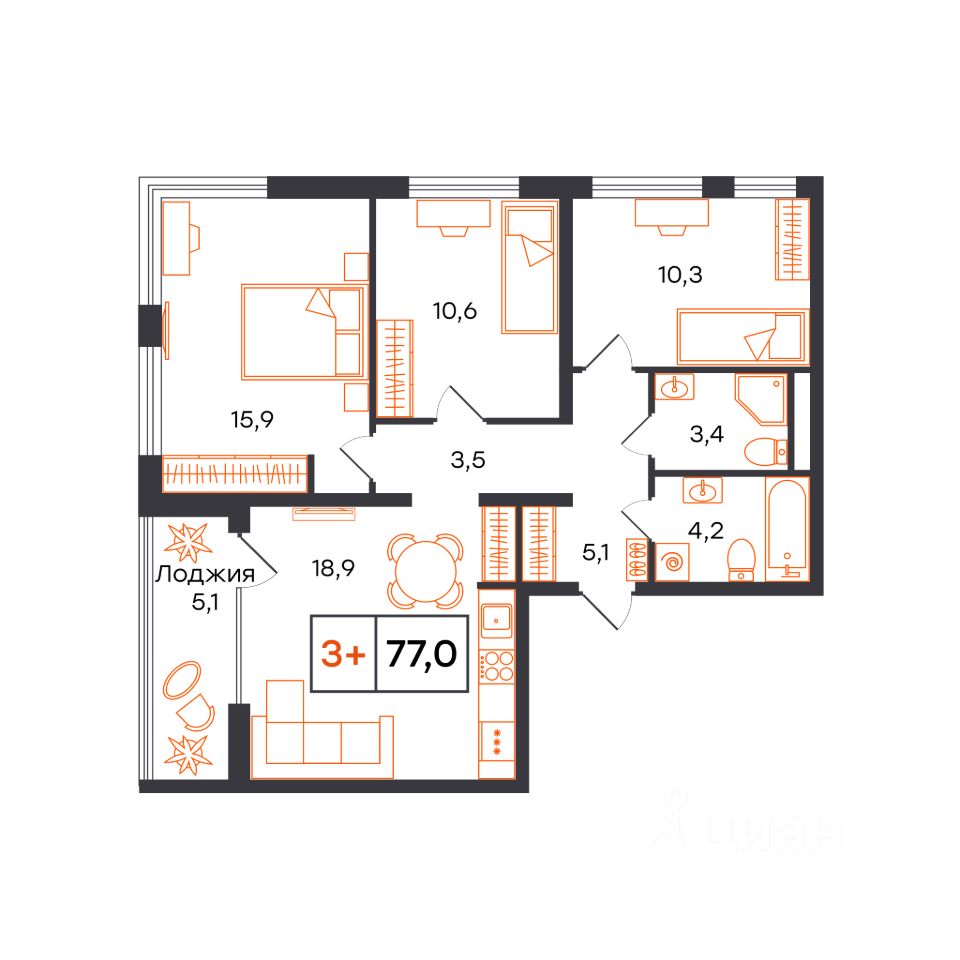 3-комн. квартира с продуманным пространством, сдается в предчистовой отделке в микрорайоне Чемпионский. Чемпионский микрорайон комплексного развития территории для комфортной и активной жизни. Монолитные дома переменной этажности от 15 до 25 этажей где каждая квартира наполнена светом, а из окна открываются завораживающие виды на заливные луга или на набережную реки Тура. Дом разделен на 4 секции, в которых предусмотрено от 2 до 3 грузопассажирских лифта. Окончание строительства - 2 квартал 2028 года. Архитектура Фасады выполнены в мягких, пастельных оттенках, подчеркивающих гармонию с окружающей средой. Для отделки использовали комбинацию гладких и фактурных штукатурок. Отдельного внимания заслуживают летние пространства: просторные балконы и уютные террасы украшают внешний облик зданий, придавая каждой постройке неповторимый характер. Подсветка фасада создает уютную атмосферу во время вечернего променада. Благоустройство Благоустройство выполнено по ландшафтному дизайну. Предусмотрено разноуровневое озеленение территории. Используется посадочный материал из местных питомников, адаптированный под климатические условия. По периметру здания благоустройство выполнено на уровне земли, имеются проезды и стоянки для автомобилей, пешеходные и велосипедные дорожки, зоны для отдыха. Безбарьерный вход в дизайнерские парадные, с теплым тамбуром и мягкими зонами ожидания. В закрытом дворе размещены детские спортивные площадки, скейтпарк, баскетбольная площадка, а также зоны отдыха взрослого населения. Здесь вы ощущаете гармонию с окружающим миром, наслаждаясь красотой природы в пределах города. Инфраструктура В шаговой доступности от жилого комплекса находятся: продуктовые магазины, пункты выдачи интернет-заказов, банкоматы, средняя общеобразовательная школа 38, общественный парк, остановка общественного транспорта.