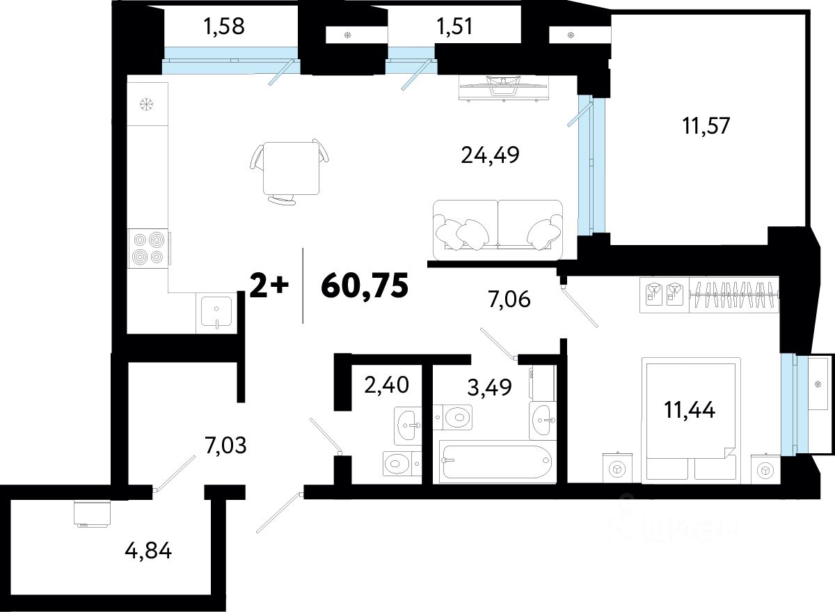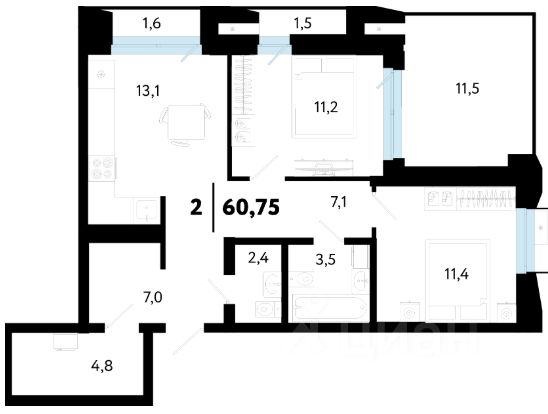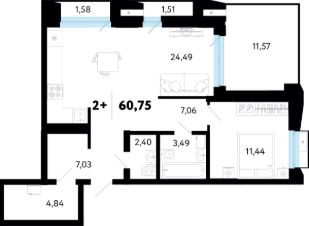 Общая площадь60,75 м²