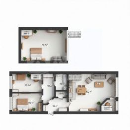 Основной особенностью данной квартиры является наличие антресольного этажа, где располагается пространство площадью 40 м2, не разделенное на зоны. Его назначение вы можете определить на свое усмотрение. Также антресоль позволяет создать объем в квартире, так как высота потолка в кухне-гостиной составляет 6м., на нижнем уровне - 2,85 м. Также предусмотрен второй свет, т.е. наличие дополнительных окон в верхнем ярусе.